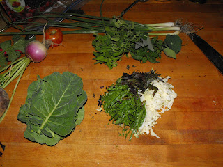 To this I added minced herbs: oregano, mint, sage, nasturtium leaves and scallions